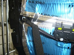 ドアの内部に手を入れて、制振材を貼っていきます。 |